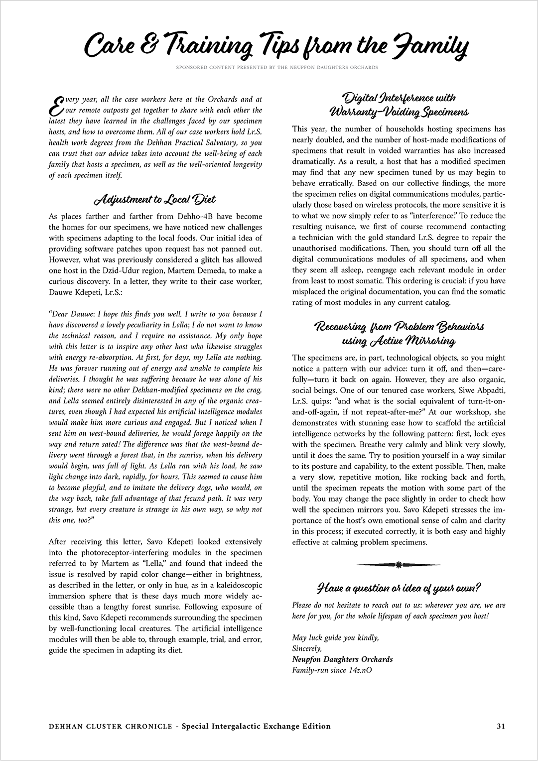 This piece is a retrofuturist magazine ad for the Neupfon Daughters Orchards, a sort of intergalactic animal shelter with all sorts of genetically-modified pets. On the back of the page is an “article” which is also sponsored content produced by Neupfon Daughters Orchards.