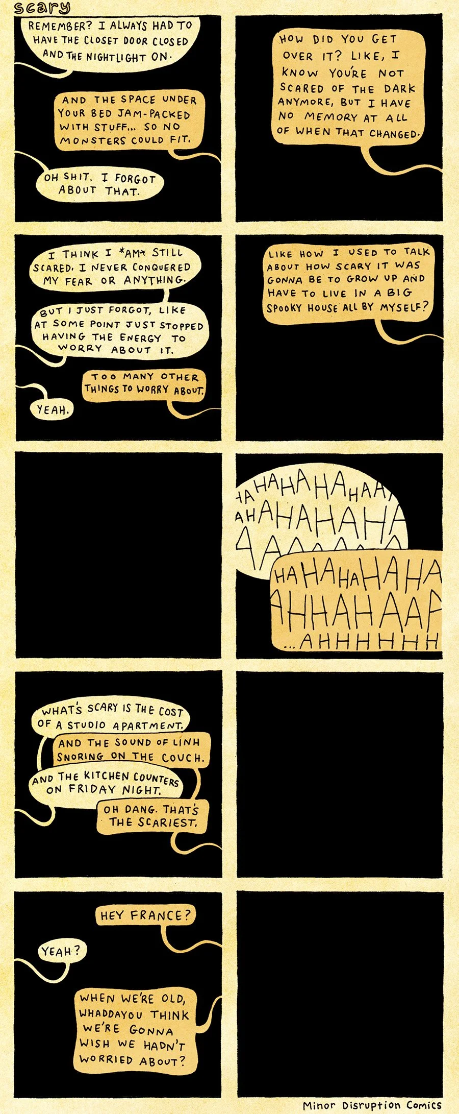 Whether real or imagined, this world could use more great friends – those special people who comfort us, inspire us, accept us exactly as we are – and occasionally tell jokes bad enough to make us writhe around on the kitchen floor in pain. Join housemates Francine, Manuel, Linh, and Imiko as they support each other through the bewilderment and exhaustion of their 20s. If the TV show “Friends” were more tender, queer, feminist, and neurodivergent, it might look something like this. Fans of Sarah’s Scribbles, Hyperbole and a Half, False Knees, and Strange Planet will find themselves at home in the world of Minor Disruption.