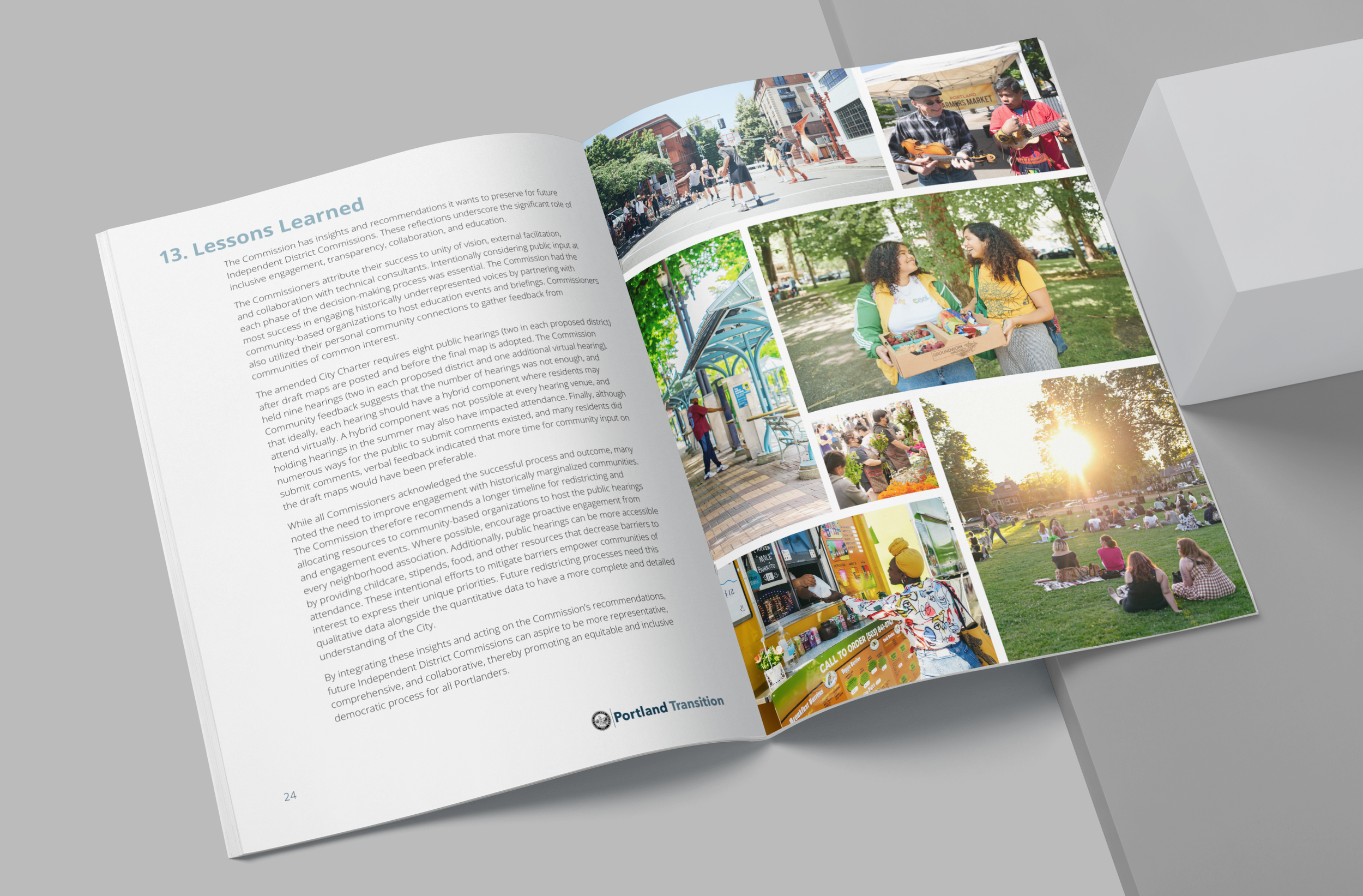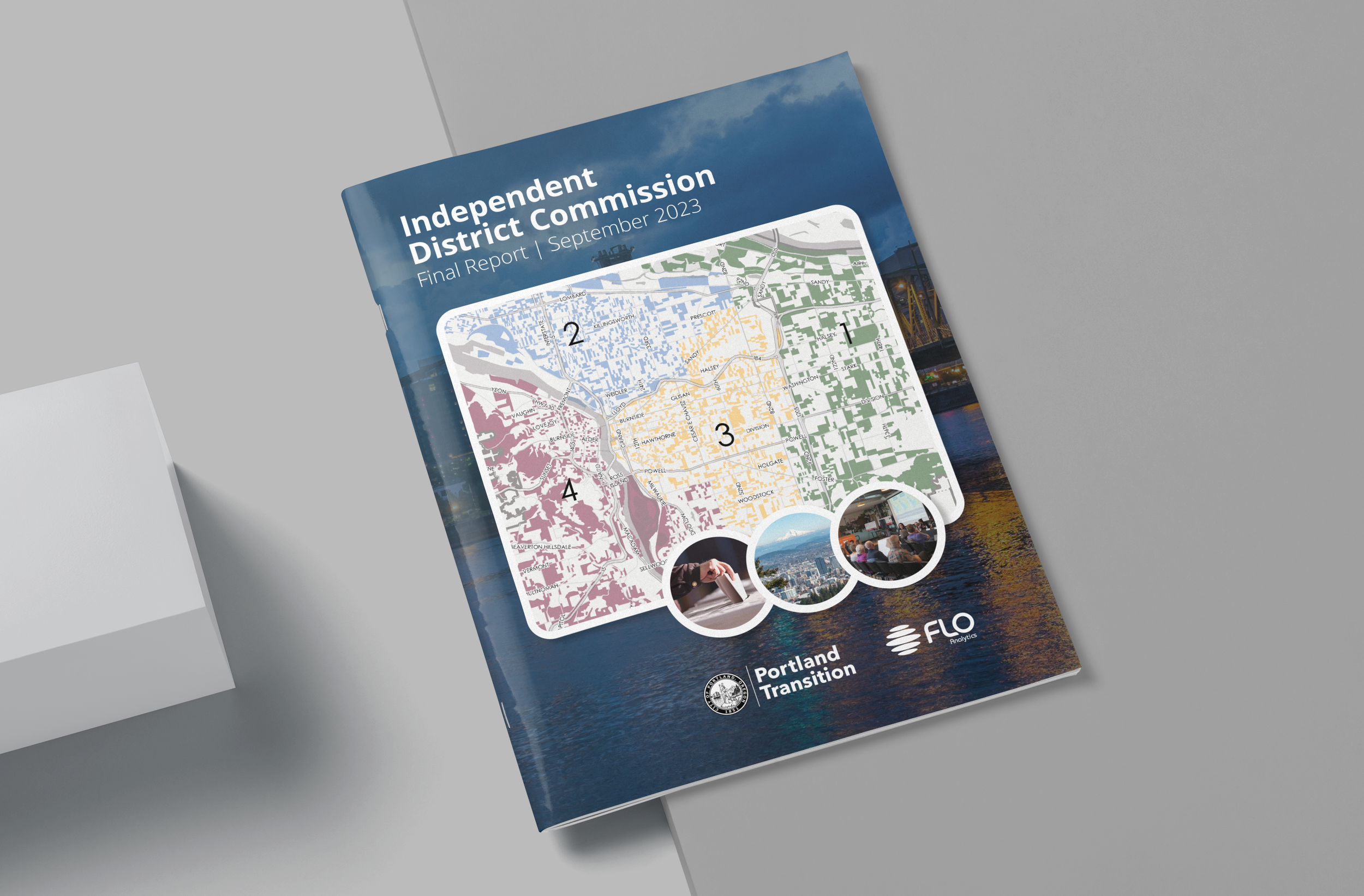 FLO Analytics and The City of Portland recently determined district boundaries for four new voting districts as part of the City of Portland Transition. At the conclusion of the six-month-long project, I worked with FLO and the City to create an 84-page final report. The report details the districting process and results, including plan criteria, mapping considerations, public engagement efforts, final district maps, and lessons learned.